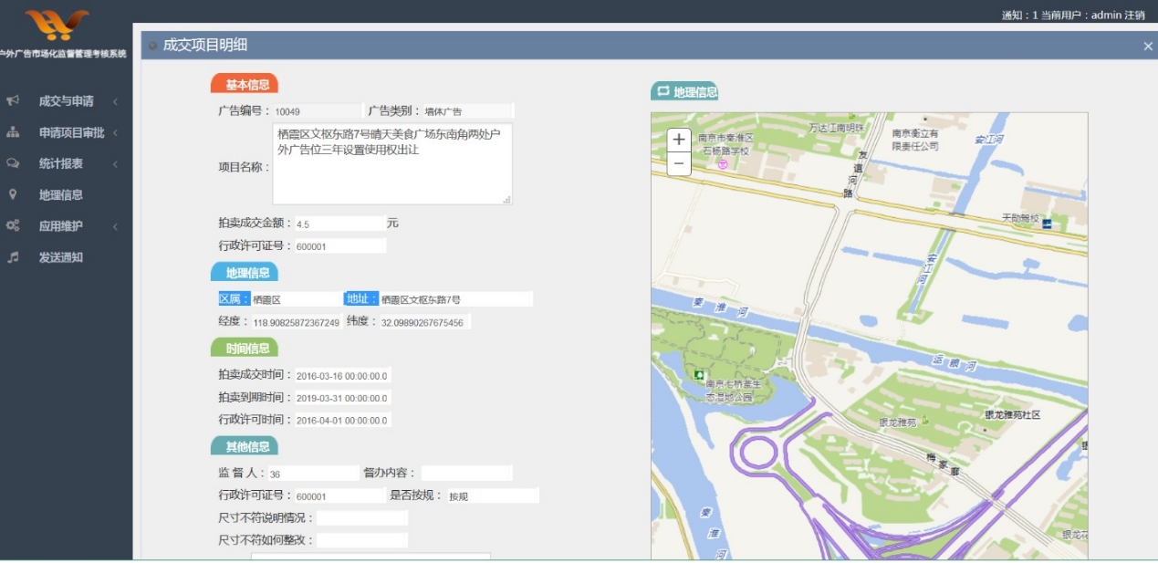 城市戶外廣告作為城市街道的重要組成部分,不僅對人們的日常感觀有重要影響,而且作為城市形象的重要部分,對城市的品味和宣傳也有舉足輕重的意義。戶外廣告管理系統(tǒng)通過對區(qū)域內(nèi)廣告牌的信息進(jìn)行管理,掌握全市戶外廣告的運行情況。系統(tǒng)提供廣告名稱、產(chǎn)權(quán)單位、使用單位、到期時間、繳費狀態(tài)、拆除狀態(tài)等信息查詢及廣告位置地圖。系統(tǒng)可通過顏色來對全市廣告進(jìn)行分類管理,該子系統(tǒng)通過地理信息技術(shù)、移動信息技術(shù)、物聯(lián)網(wǎng)技術(shù)的廣泛應(yīng)用,為進(jìn)一步提高城市管理水平,加強城市戶外廣告的可視化、精細(xì)化管理,提供了更加便捷高效的手段。