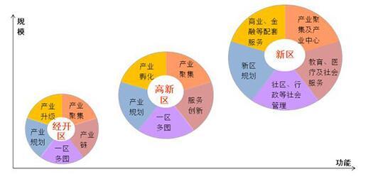 從時間維度來看,我國園區(qū)正在從傳統(tǒng)的工業(yè)園區(qū)向新區(qū)過度,在形式上有從低級向高級,由單一向綜合園區(qū)發(fā)展的趨勢。尤其是經(jīng)開區(qū)和高新區(qū)通過產(chǎn)業(yè)結(jié)構(gòu)升級和服務(wù)內(nèi)容升級,打造多產(chǎn)業(yè)聚集和社會服務(wù)職能,并逐步向新區(qū)方向發(fā)展。